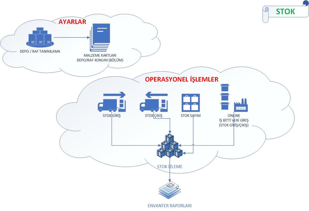 İŞ BİTİR işlemi sonrasında üretilen Yarı Mamul parçalar için stok kayıtları otomatik olarak oluşturulur. Ve bu verilerden Üretimde verimlilik takibi yapılabilir. Siparişlerin durumu, Personel Verimlilikleri, Makine Dolulukları, Stok durumu gibi bilgilere erişilebilir.