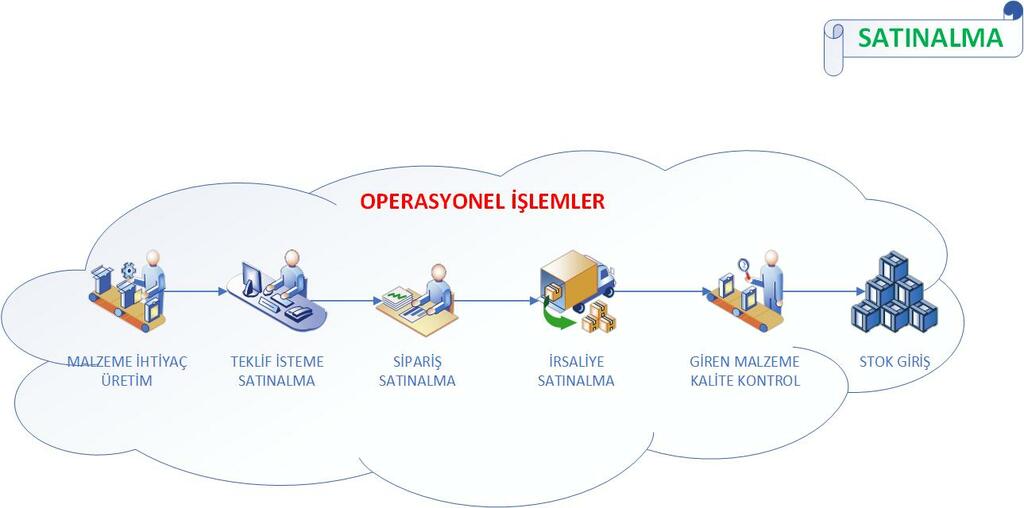 Üretim hattından oluşturulacak Malzeme İsteklerinden başlamak üzere isteklerin onaylanması, satınalma personelinin değişik firmalardan Teklif İstemesi, bir firmadan satınalmaya karar verilmesi durumunda Satınalma Siparişi, Depoya malzeme girişini içeren Satınlama İrsaliyesinin işlenmesi ve muhasebe biriminin yapacağı Fatura Giriş işlemlerini içeren modüllerden oluşur. Üretim Personeli, Satınalma Personeli, Depo sorumlusu ve Muhasebe personelinin aynı veri tabanı üzerinden rahatlıkla çalışmasını sağlar.