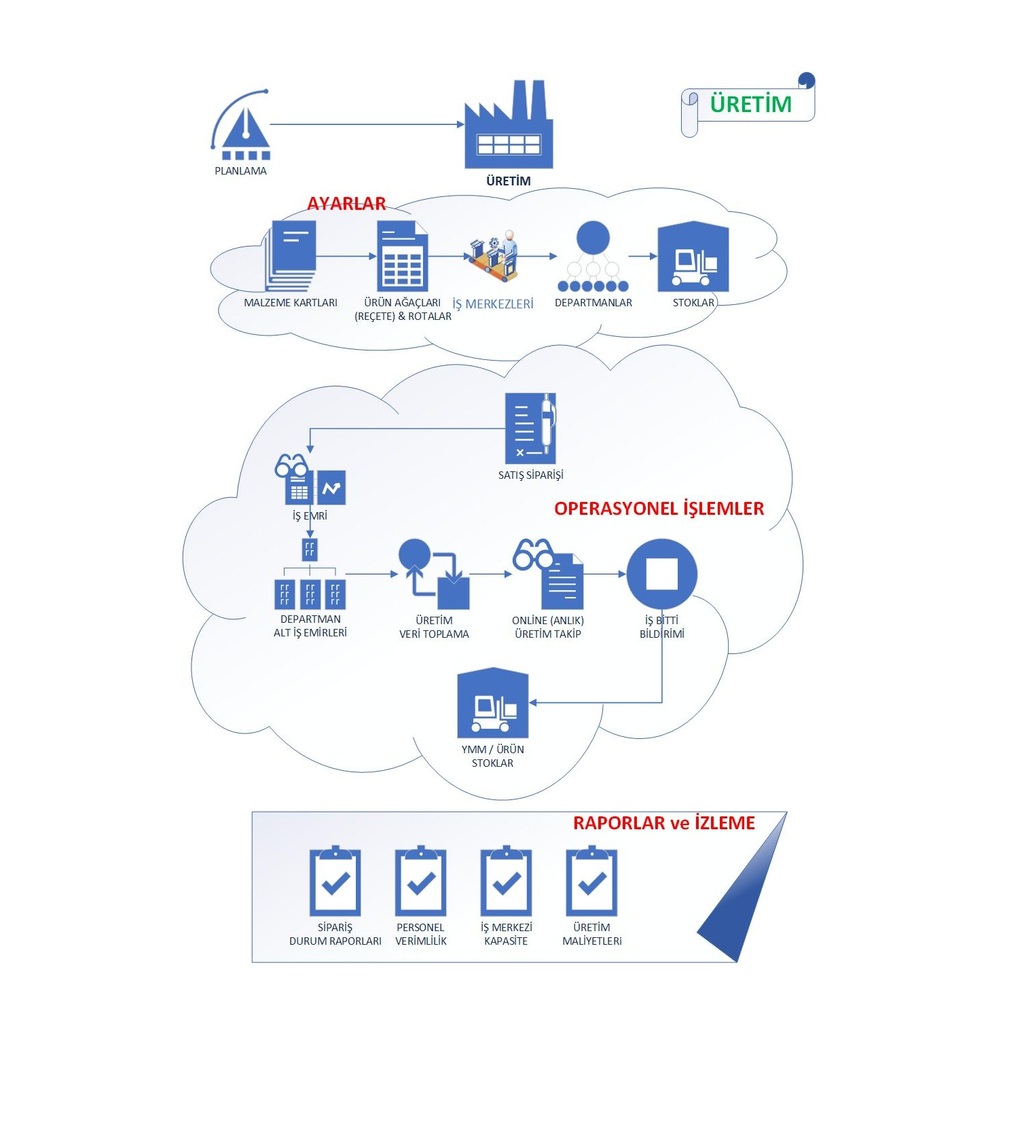 Satış siparişinin oluşturulması sonrasında, siparişe bağlı İş Emri oluşturulması ile başlayan süreçtir. İş Emri, üretim sahasındaki personele iş ile ilgili sözlü bilgi akışına gerek duyurmayacak detaylara sahip olmalıdır. Ürünlerin niteliğine göre Ürün Ağacı ve Rota bilgileri tanımlanmalıdır.